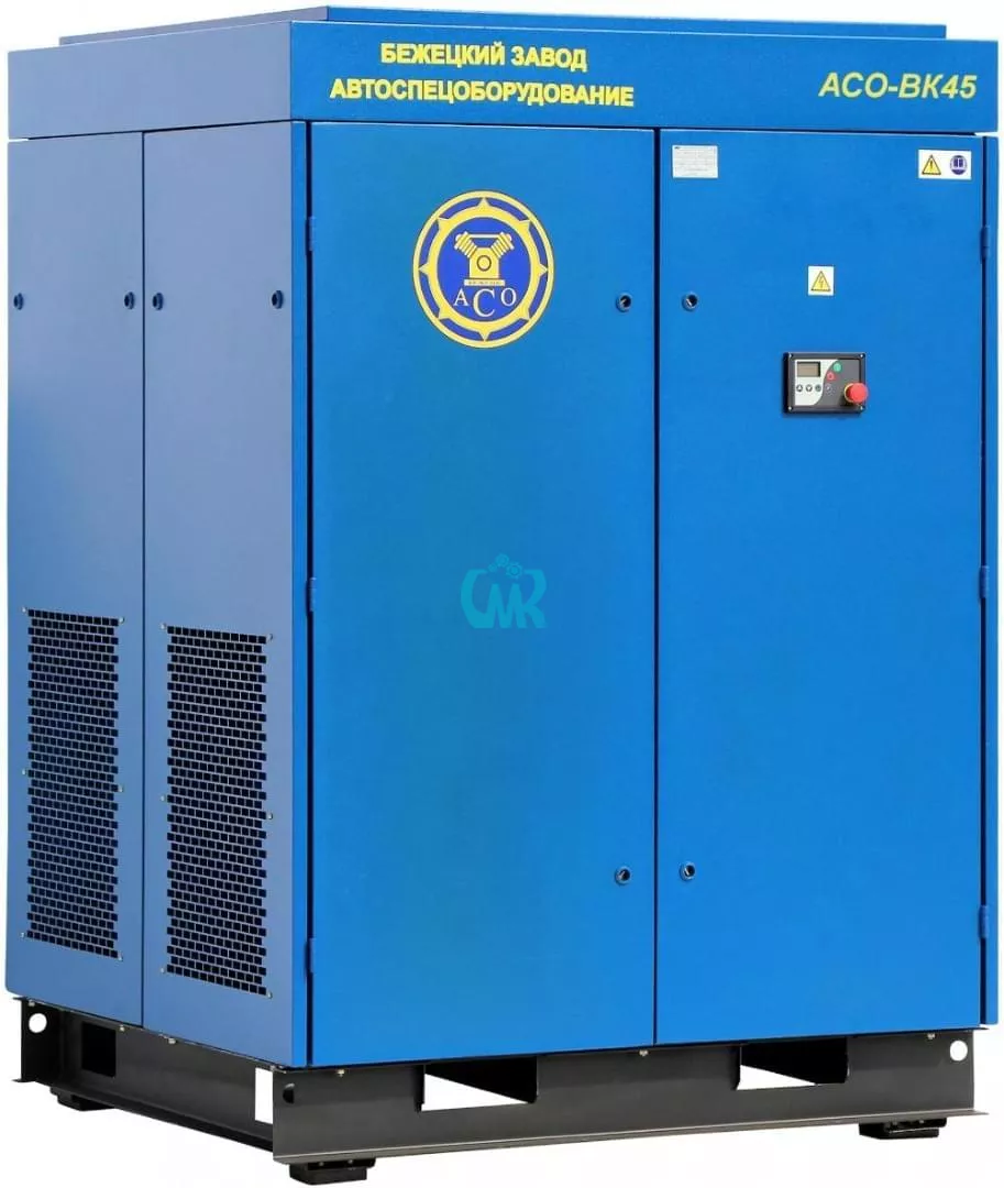 Винтовой компрессор АСО-ВК45/13 производства Бежецкого завода АСО оснащен винтовым блоком EVO9 (Rotorcomp) и контроллером CMC Airmaster P1, имеет производительность по нагнетанию 5,5 м3/мин при максимальном рабочем давлении 13 атм. Винтовой блок приводит в движение трехфазный электродвигатель мощностью 45 кВт. Уровень шума находится в пределах 72 - 76 дБа. Габариты установки составляют 130 х 125 х 180 см., масса 900 кг. Содержание масла в сжатом воздухе 3 мг/м3. Диапазон температур от 10 до 45°С, расход масла на унос не более 1 г/час. Количество масла в маслосистеме 15 л.